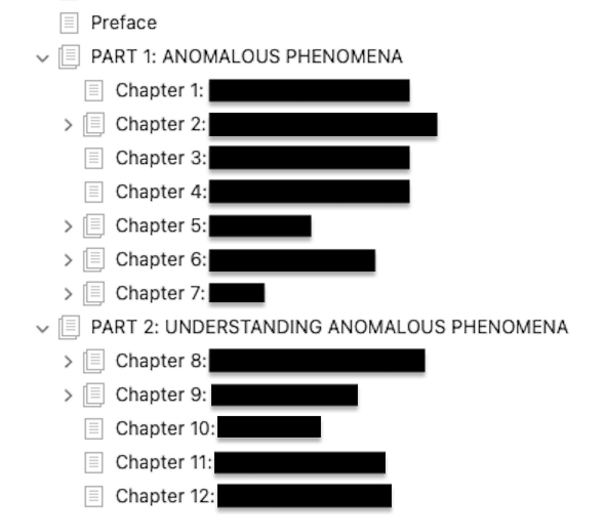 Below you will find the Table of Contents, which I’ve highly redacted (because that’s what you do when you release information about UFOs)…